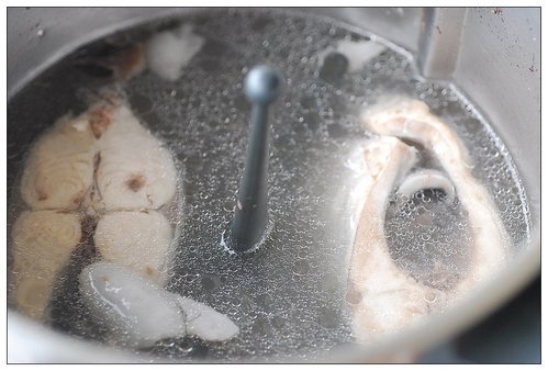 從冷凍庫中取出二塊虱目魚,不用退冰,沖洗一下就可以了(因入冷凍庫前就處理乾淨)